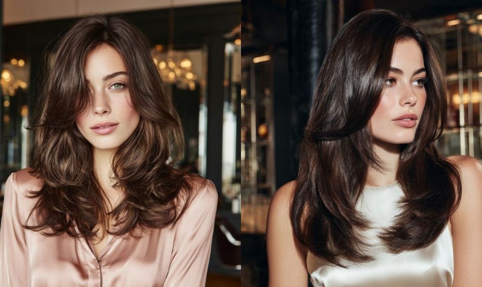 Chocolate tones shimmer like polished wood under candlelight. The gloss adds that liquid depth — smooth to the touch, never sticky. Long layers keep the cut fluid so light travels down in ribbons, creating dimension through motion. It’s rich but gentle, indulgent without trying too hard. Each flicked end softens reflection into warmth, giving polish a lived-in feel.